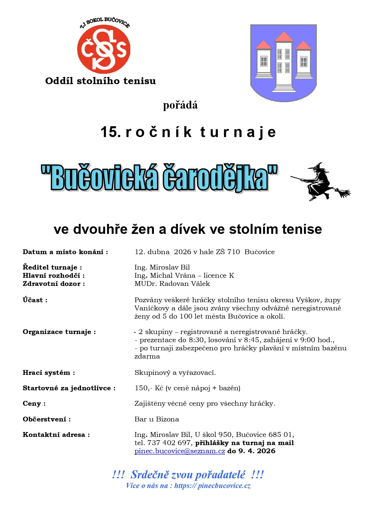tel. 737 402 697, přihlášky na turnaj na mail: pinec.bucovice@seznam.cz do 9. 4. 2026